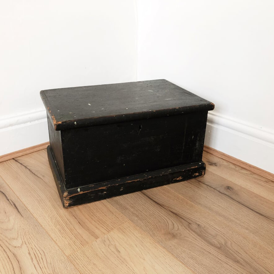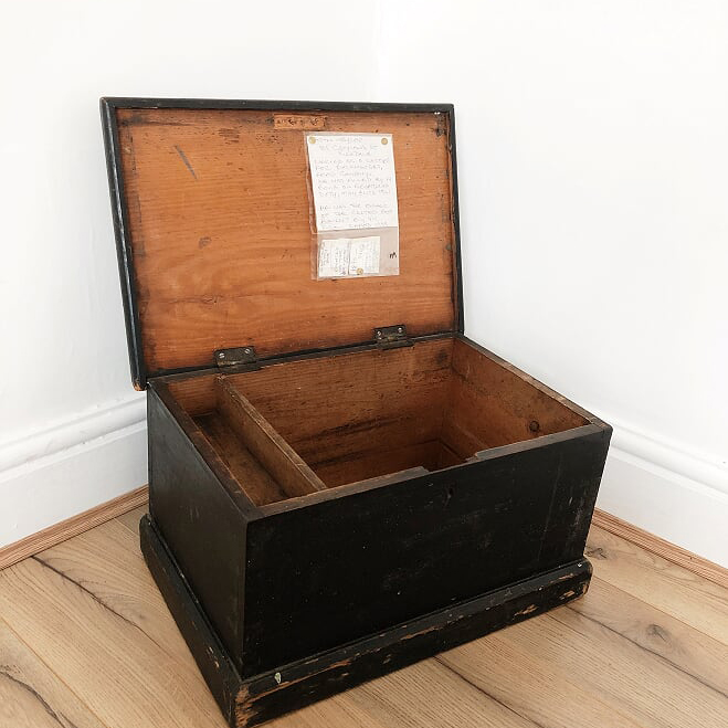 Underneath, another piece of paper reads: Carters Ditty Box Painted in Tar for waterproofing. 1890 – 1905 Driver sat on it and kept gear in it.”